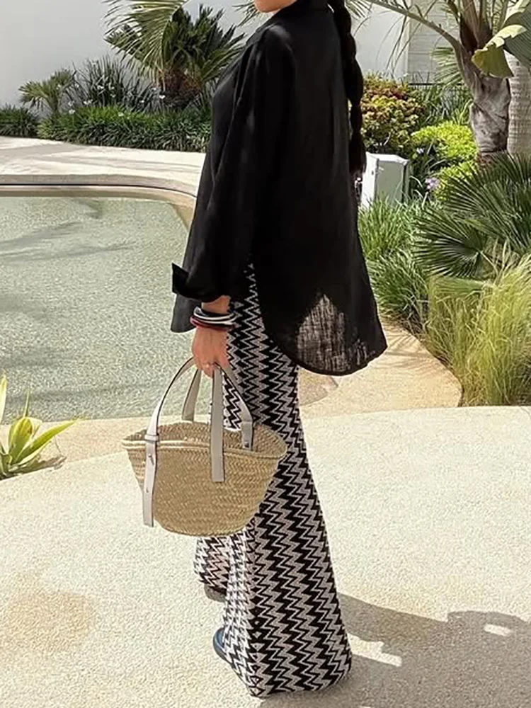 Casual Holiday Patchwork Chic Pants, Women Spring Summer Elastic Waist Simple Trousers, Print Elegant Fashion Ladies Flare Pants